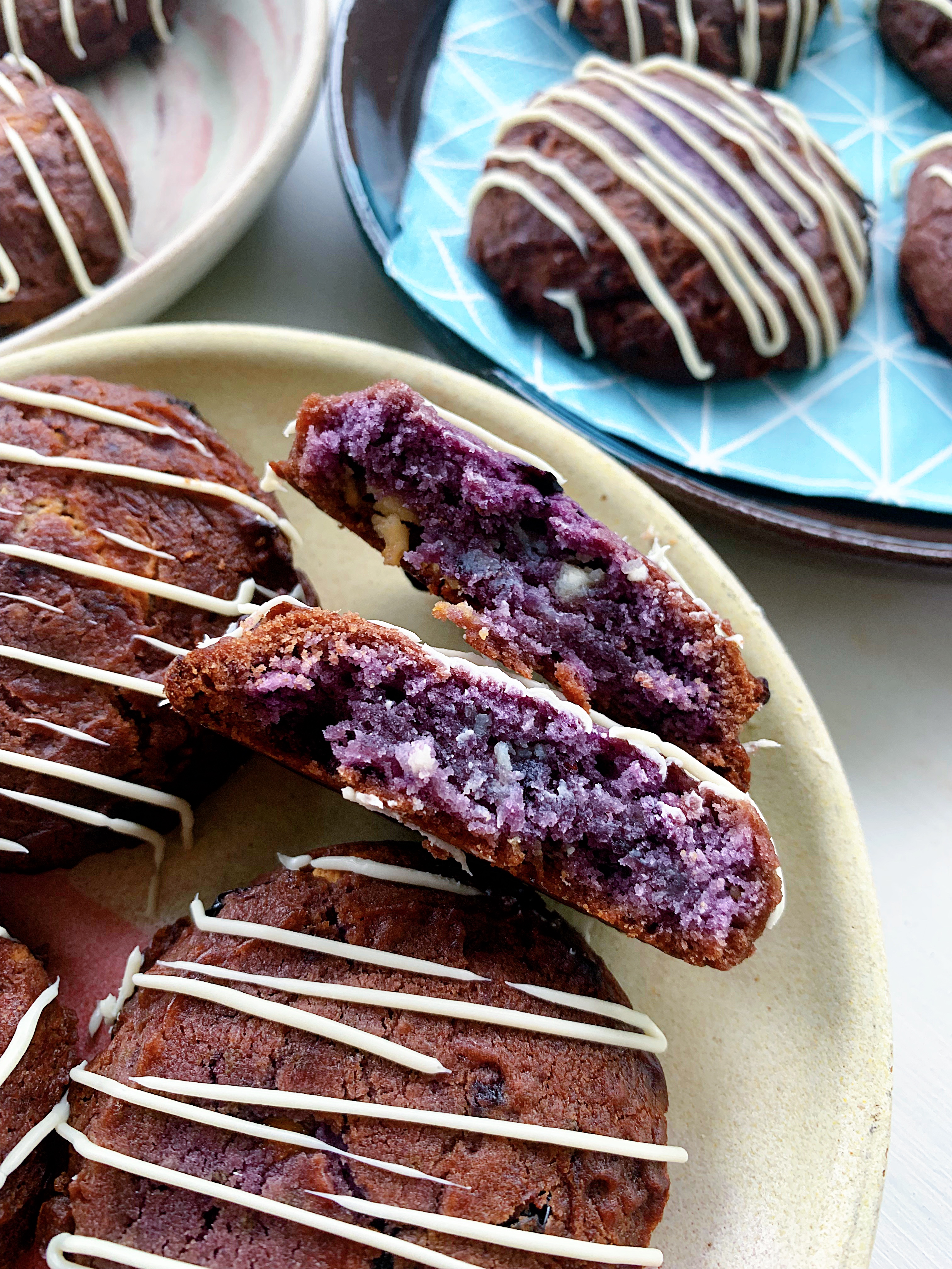 My final product wasn’t as vibrantly purple as the images – possibly because I didn’t have frozen blueberries, and possibly due to the oven temperature and bake time. I wanted it to brown up more to prevent the end product from having a mushy texture. As a result the cookies also turned out a bit more.. brown haha. But the insides did turn out a really vibrant purple, and loved how this was achieved without food colouring!