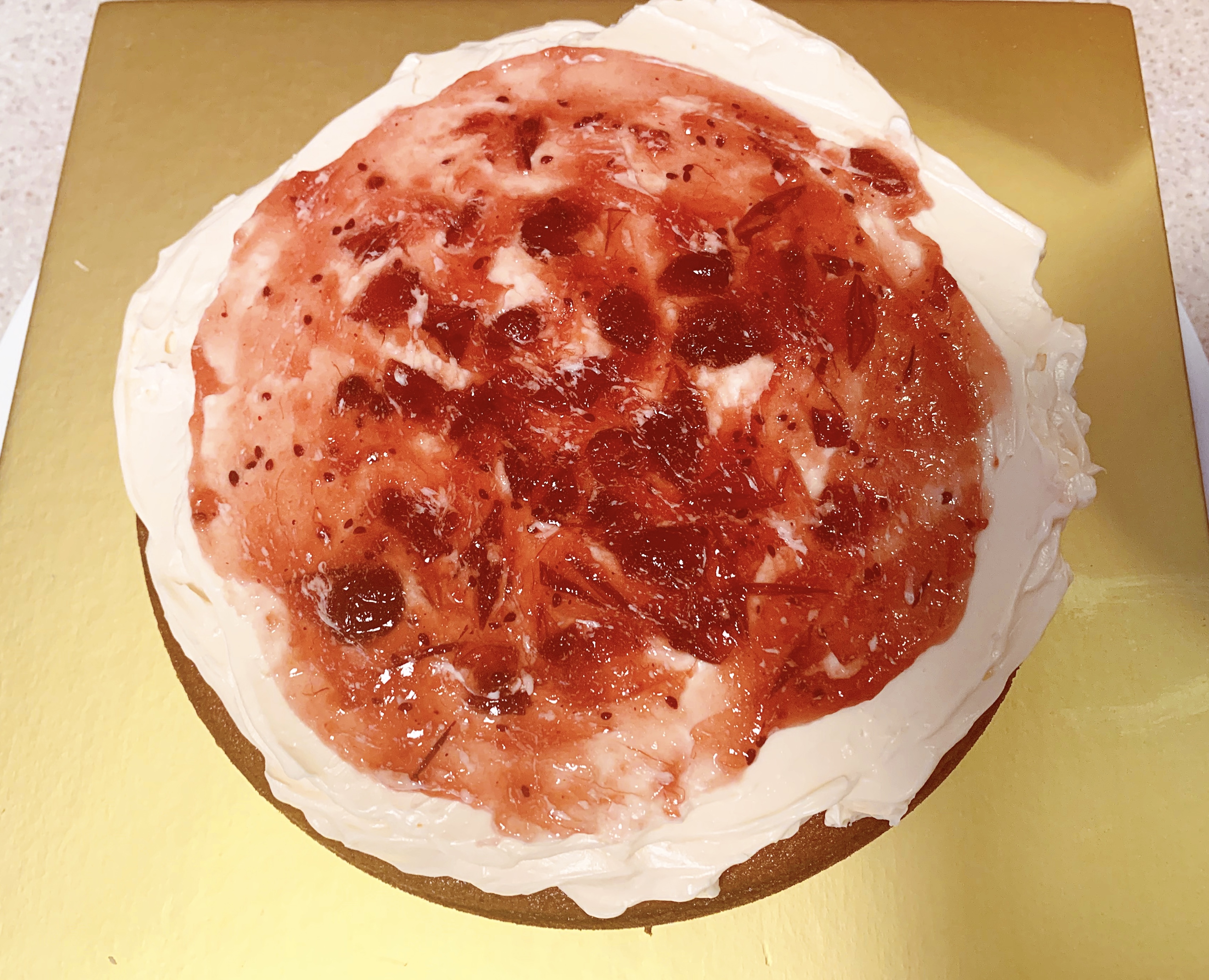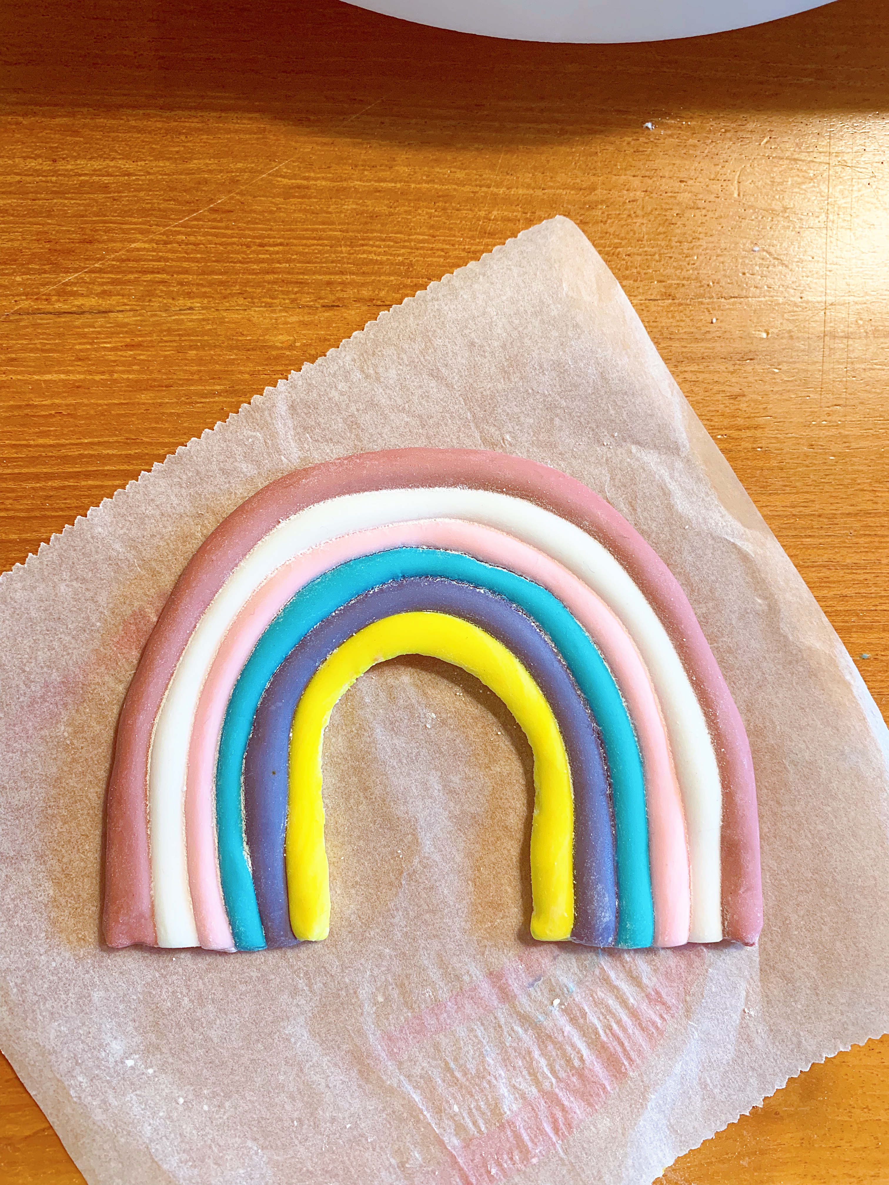 To make Vanilla Cake (Reverse Cream method): Preheat the oven to 350°F (180°C). Butter the bottom of three 7-inch round pans and line with baking paper. In the bowl of an electric mixer, mix together the cake flour, sugar, baking powder, baking soda, and salt on low speed with the paddle attachment for 1 minute. Keeping the mixer on low speed, add the cubed butter and combine until the mixture resembles coarse sand (about 4 minutes). In a separate bowl, whisk together the oil, eggs, buttermilk, and vanilla. With the mixer on low speed, gradually add the wet ingredients and mix just until combined. Weigh out equal amounts into 3 7-inch cake pans. Tint the cakes with food coloring (I used varying amounts of pink food colouring). Bake for about 35 minutes or until a toothpick inserted into the center comes out clean. Let the cakes cool completely before decorating. To make Swiss Meringue buttercream: In a large saucepan, place mixing bowl over a pot of barely simmering water. Add egg whites and cups sugar and whisk together until frothy. Whisk constantly until mixture reaches 160˚F (takes about 3 min). Sugar should be fully dissolved (no granules when rubbing mixture between finger tips). Mixture will feel hot to the touch (or like the temperature of warm milk). Once bowl is at room temperature, switch to paddle attachment, and whip together until soft peaks form. Add butter 1 Tbsp at a time. Once all butter is in, scrape down the bowl and continue beating until it reaches a thick whipped consistency. It may look lumpy – it’s a good sign, keep beating until it changes consistency to become smooth, thick and whipped. Add vanilla extract and salt and mix on med-high until incorporated and silky. To Assemble and Decorate: Trim off excess of the layers (freeze before hand helps). Place first first layer on cake board, making sure to frost between each layer and crumb coat. Add raspberry jam between each layer. Use a cake turntable to smooth white frosting over entire cake. Use white fondant to make a rainbow, with the method from this video. Place it on the cake as a topper. |