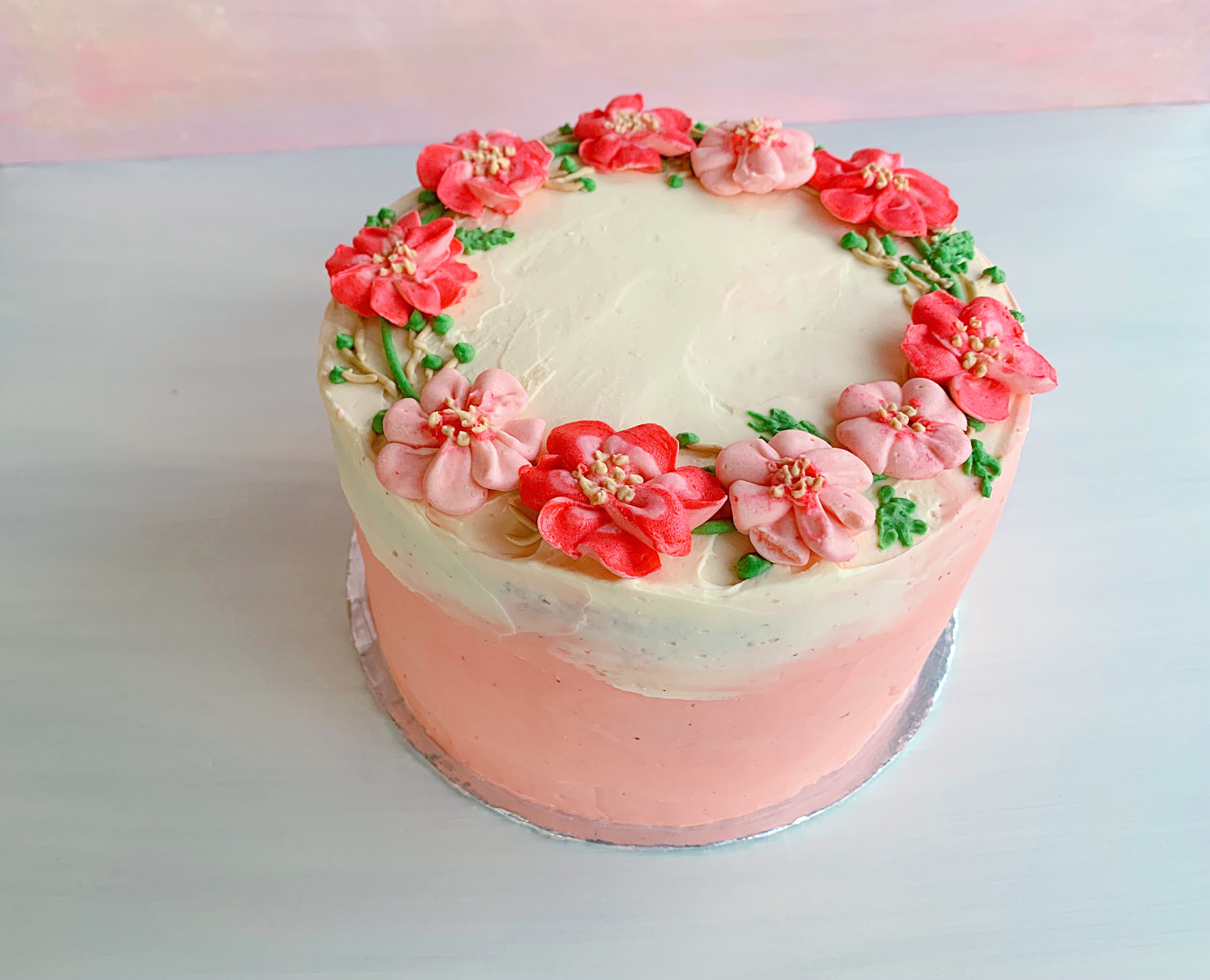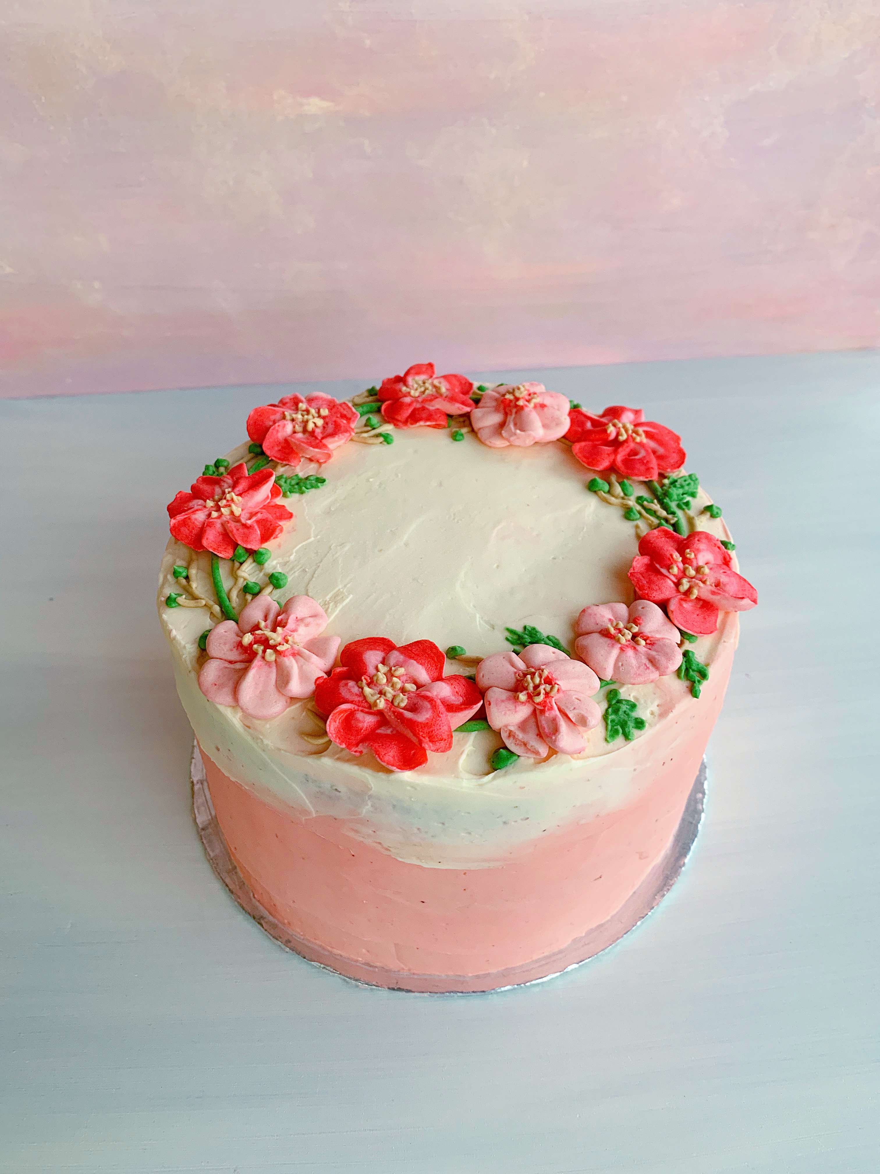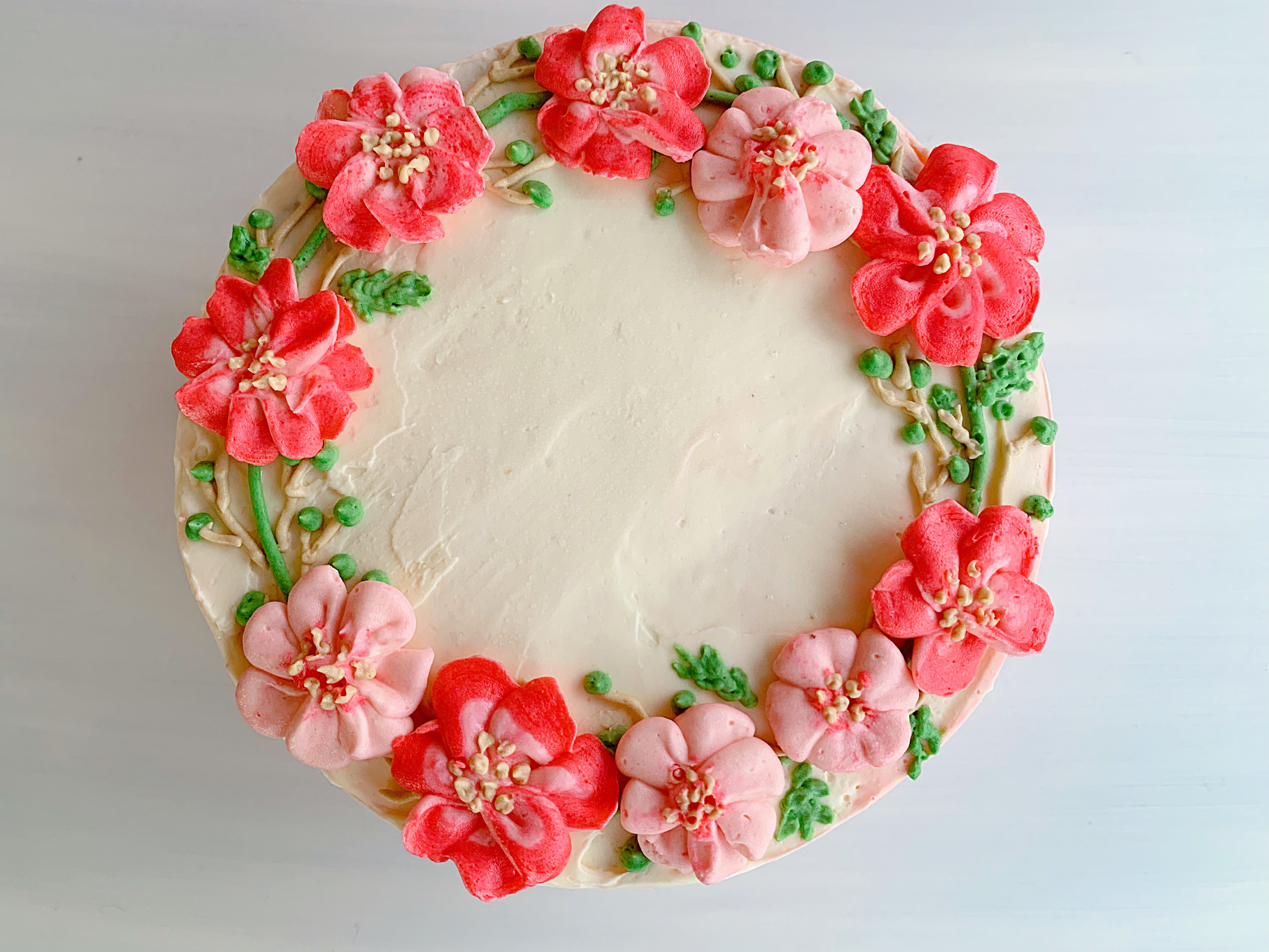 To Make Rose Vanilla Cake (Reverse Cream Method): Preheat the oven to 350°F (180°C). Butter the bottom of three 7-inch round pans and line with baking paper. In the bowl of an electric mixer, mix together the cake flour, sugar, baking powder, baking soda, and salt on low speed with the paddle attachment for 1 minute. Keeping the mixer on low speed, add the cubed butter and combine until the mixture resembles coarse sand (about 4 minutes). In a separate bowl, whisk together the oil, eggs, buttermilk, vanilla and rose extract. With the mixer on low speed, gradually add the wet ingredients and mix just until combined. Weigh out equal amounts into 3 7-inch cake pans. Tint cake slightly using red food colouring. Bake for about 35 minutes or until a toothpick inserted into the center comes out clean. Let the cakes cool completely before decorating. To make Swiss Meringue buttercream: In a large saucepan, place mixing bowl over a pot of barely simmering water. Add egg whites and cups sugar and whisk together until frothy. Whisk constantly until mixture reaches 160˚F or 71˚C (takes about 3 min). Sugar should be fully dissolved (no granules when rubbing mixture between finger tips). Mixture will feel hot to the touch (or like the temperature of warm milk). Once bowl is at room temperature, switch to paddle attachment, and whip together until soft peaks form. Add butter 1 Tbsp at a time. Once all butter is in, scrape down the bowl and continue beating until it reaches a thick whipped consistency. It may look lumpy – it’s a good sign, keep beating until it changes consistency to become smooth, thick and whipped. Add vanilla extract and salt and mix on med-high until incorporated and silky. To Assemble and Decorate: Trim off excess of the layers (freezing before hand helps). Place first first layer on cake board, making sure to frost between each layer and crumb coat. Place chopped lychee pieces between each cake layer. Use a cake turntable to smooth white frosting over entire cake. To pipe cherry blossom flowers: use Wilton Tipe #59 and #97 to make petals. For the branches and leaves, use #4 and #5 to pipe brown brances and dot with green leaves. Enjoy! |