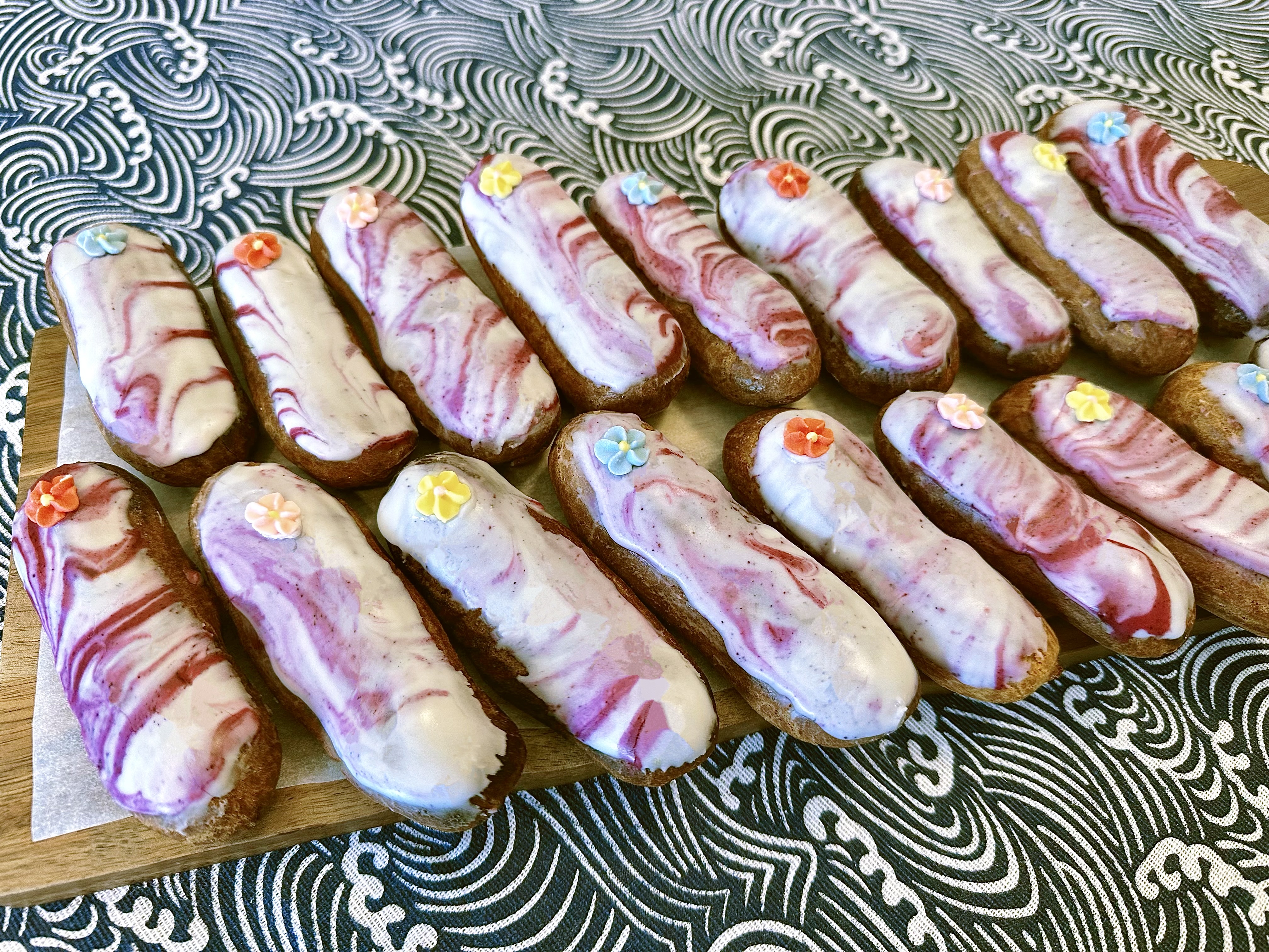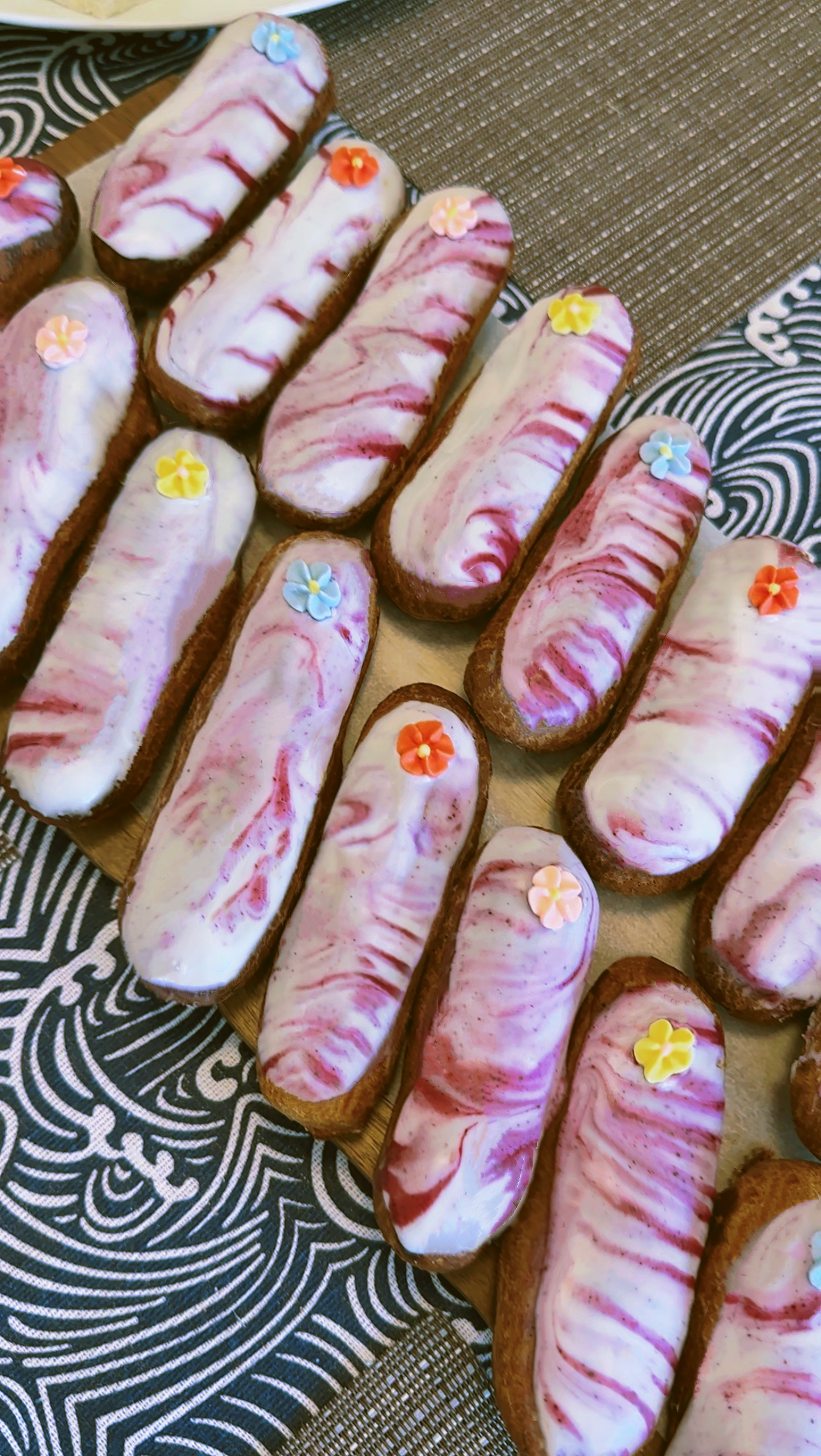To prepare the choux paste: Bring the water, milk, butter, sugar, and salt to a strong simmer in a medium saucepan over medium heat. Remove the pot from the heat and add all the flour at once. Stir vigorously until the flour is completely incorporated. Return to heat and mix the dough, being careful not to scrape the bottom of the pan as a film may form there while cooking. Cook until the dough reaches 75°C (170°F), about two minutes. You may see a film form at the bottom of the pan. Transfer the dough to a bowl and, using a stand mixer fitted with the paddle attachment, mix on the lowest speed for about one minute and thirty seconds, such that the dough cools down to 60°C (140°F). You can also do this with a spoon or a hand mixer. Add half of the eggs and mix, still on the lowest speed if using a stand mixer, until combined. With the mixer still running, or your hand still stirring, add the rest of the beaten eggs slowly while you continue to mix. Once incorporated, mix for an additional minute until the dough is smooth. To pipe & bake éclairs Prepare a parchment paper lined baking sheet by dabbing a bit of choux between the paper and the pan at each corner to secure the paper to the pan. Transfer the choux to a pastry bag fitted with a star tip. Pipe the éclairs in 13cm (5 inch) lengths, and about 2.5cm (1 inch) wide, at about a 45° angle between the bag and the parchment paper-lined baking sheet. Space the éclairs about 5cm (2 inches) apart. If needed, mark lines with a pen or pencil on the parchment paper to ensure the éclairs are equal in length. Dust with icing sugar. Bake in a preheated oven at 180°C (350°F) for forty minutes, or until slightly darker than a golden brown. Remove from the oven and make a thin slit at the bottom of each éclair while still hot to let the steam escape. Let cool completely before filling and glazing. To make Chocolate Custard filling Make this the night before. Prepare chocolate mixture by bringing milk to boil and turn off the heat. Mix in chopped chocolate till smooth Prepare custard. Bring milk, sugar and vanilla to a boil. Meanwhile, beat egg yolks and sugar and add cornstarch. When the milk boils remove from heat and temper the yolk mixture with one-third of the hot milk whisking constantly. Pour the tempered mixture into the saucepan and return to the heat. Bring to boil and cook for 2 minutes whisking swiftly on medium heat. Remove from the stove and mix in the chocolate mixture. Press through a fine mesh-sieve and cool down completely, cover with plastic wrap in contact to prevent a skin from forming. Push off the vanilla pod and let dry. Save for later use. Once completely chilled, whisk the chocolate custard until smooth. To make royal icing glaze and assemble In the bowl of a stand mixer, beat egg whites on medium-low speed until frothy, about 1 minute. Slowly add in icing sugar and vanilla. Once fully incorporated, increase speed to medium-high and beat until stiff shiny peaks form. Divide icing among small bowls, and dye with gel food coloring. Create marbling effect using the technique here. Dip each eclair into the marble icing. Store eclairs refrigerated up to 3 days |