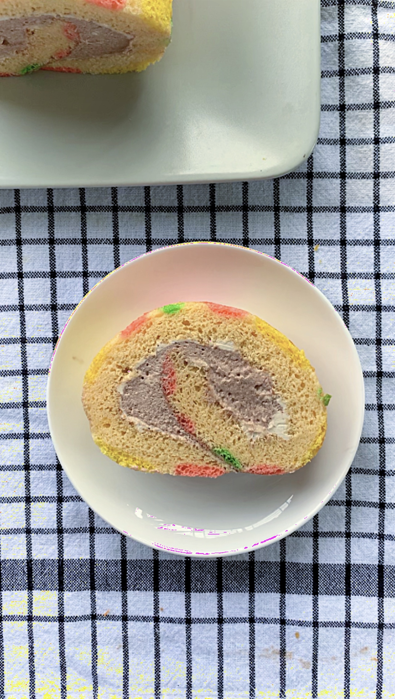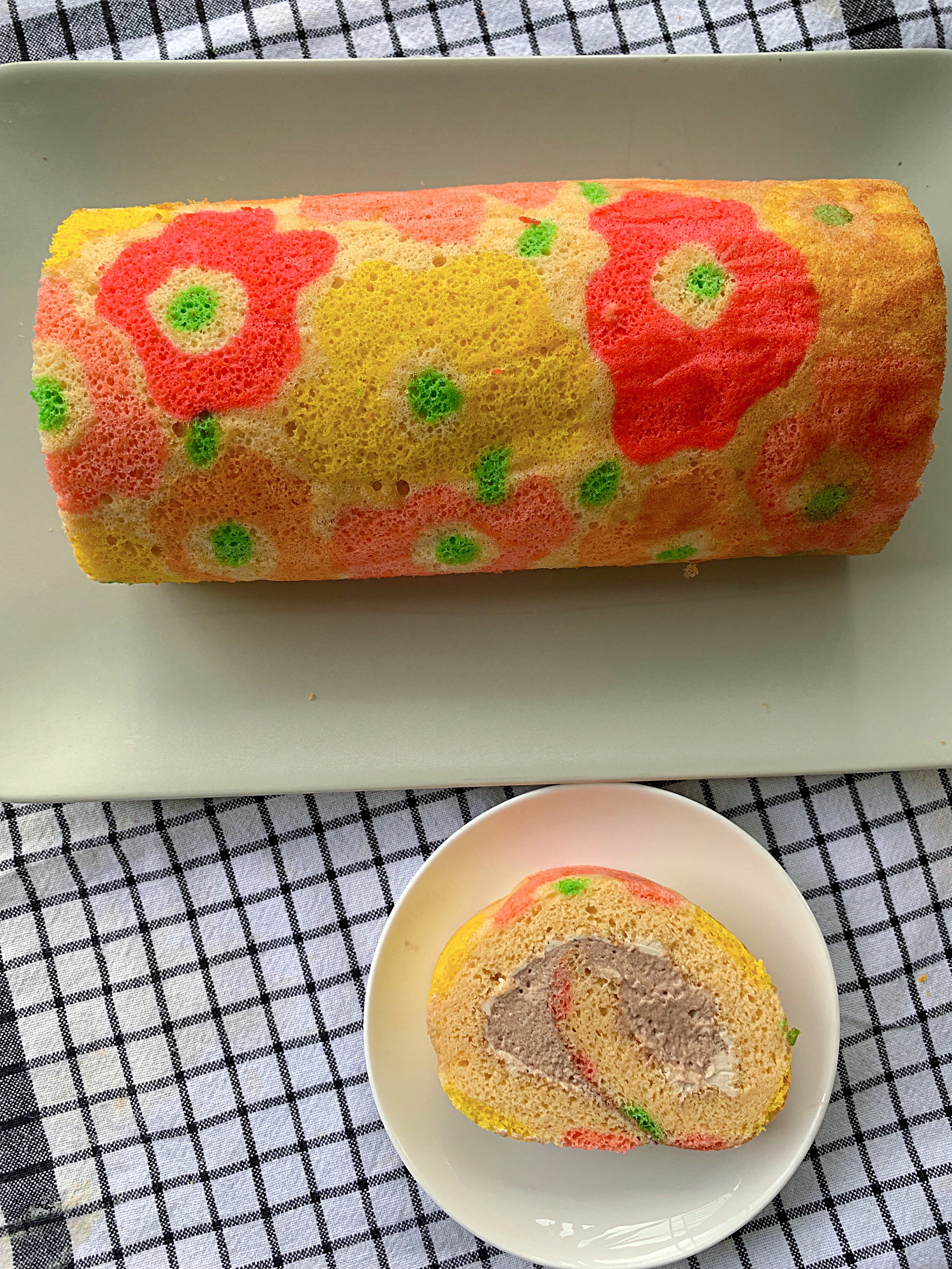Line a 9″ x 12″ (23 x 30cm) Swiss Roll tray with parchment paper. Print out the Marimekko design template on a full sized A4 sheet. Place below the parchment paper. Using electric mixer, beat cold egg white till foamy then gradually add in sugar and cornflour mixture and continue to beat till medium stiff peak form. Beat egg yolk and caster sugar till thick and creamy. Stir in oil, milk, vanilla essence and sieved flour mixture (flour and baking powder) in sequence till combined. With a hand whisk/spatula, gently fold meringue into yolk batter in 3 batches till combined (do not over mix). Flower Batter Remove 3 Tablespoons of plain batter into 5 small bowl and colour with yellow, orange, pink, red and green food colouring. Pipe on the prepared parchment paper to fill the centre of the flowers. Remove the stencil paper prior to baking! Bake in preheated 170°C oven for 90 seconds. Pour reserved plain batter over the prepared flowers, smooth the surface using a spatula and bake for another 15 minutes or till a skewer inserted in the centre of the cake and comes out clean. Immediately remove sponge cake from the tray, turn it over onto another piece of parchment paper before peeling off the one that was attached on it. Cover the parchment paper back and use a clean towel to roll it up, so that it can cool properly in that position. Set cake aside to cool. To Make Earl Grey and Chocolate whipped cream To make gelatin mixture, add water to a microwave safe bowl and sprinkle the unflavored gelatin on top. Allow to sit for a few minutes. Either use a double boiler method, or microwave for a few seconds until gelatin is fully resolved. Place around ¼ cup of the cream into a small saucepan and bring to a simmer. Remove from heat, add earl grey teabags and allow to steep for 15-20 minutes. Squeeze teabags before discarding. Chill until room temperature before using. Note: if using tea leaves, steep through tea strainer. Place earl grey cream, remaining heavy cream, vanilla extract, and powdered sugar in a large bowl of a stand mixer fitted with the whisk attachment. Whip until soft peaks. Add 1/3 of the gelatin mixture to stabilize the cream. Whisk until medium-stiff peaks form. For chocolate whipped cream, whip 300ml heavy cream until soft peaks and add vanilla extract, powdered sugar and cocoa powder. Add remaining 2/3 of gelatin mixture to stabilize the cream. Whisk until medium-stiff peaks Assembly Place earl grey cream on top of the roll cake, then chocolate whipped cream. Roll and place in the fridge to set. Slice to reveal the insides, and enjoy! |