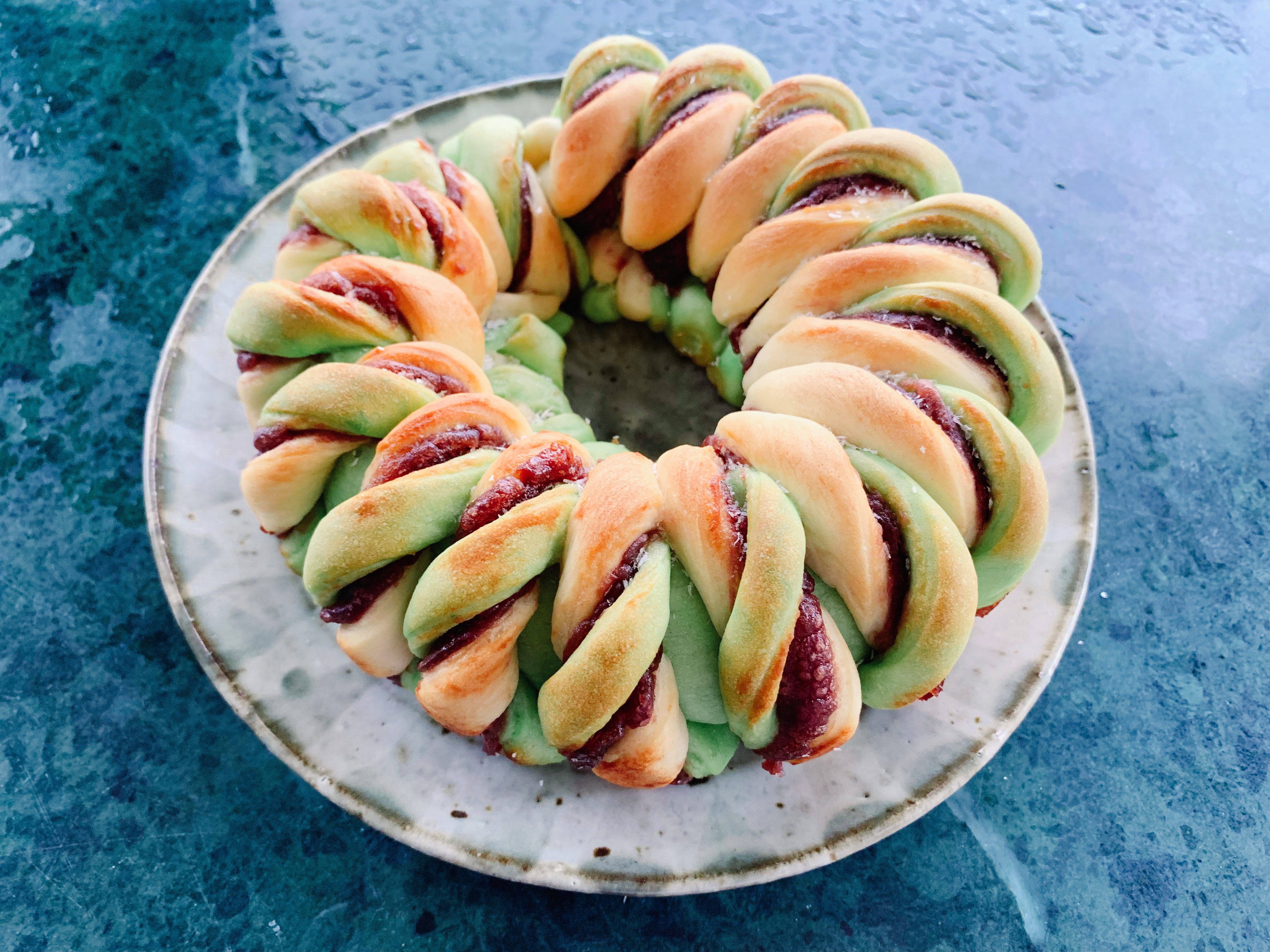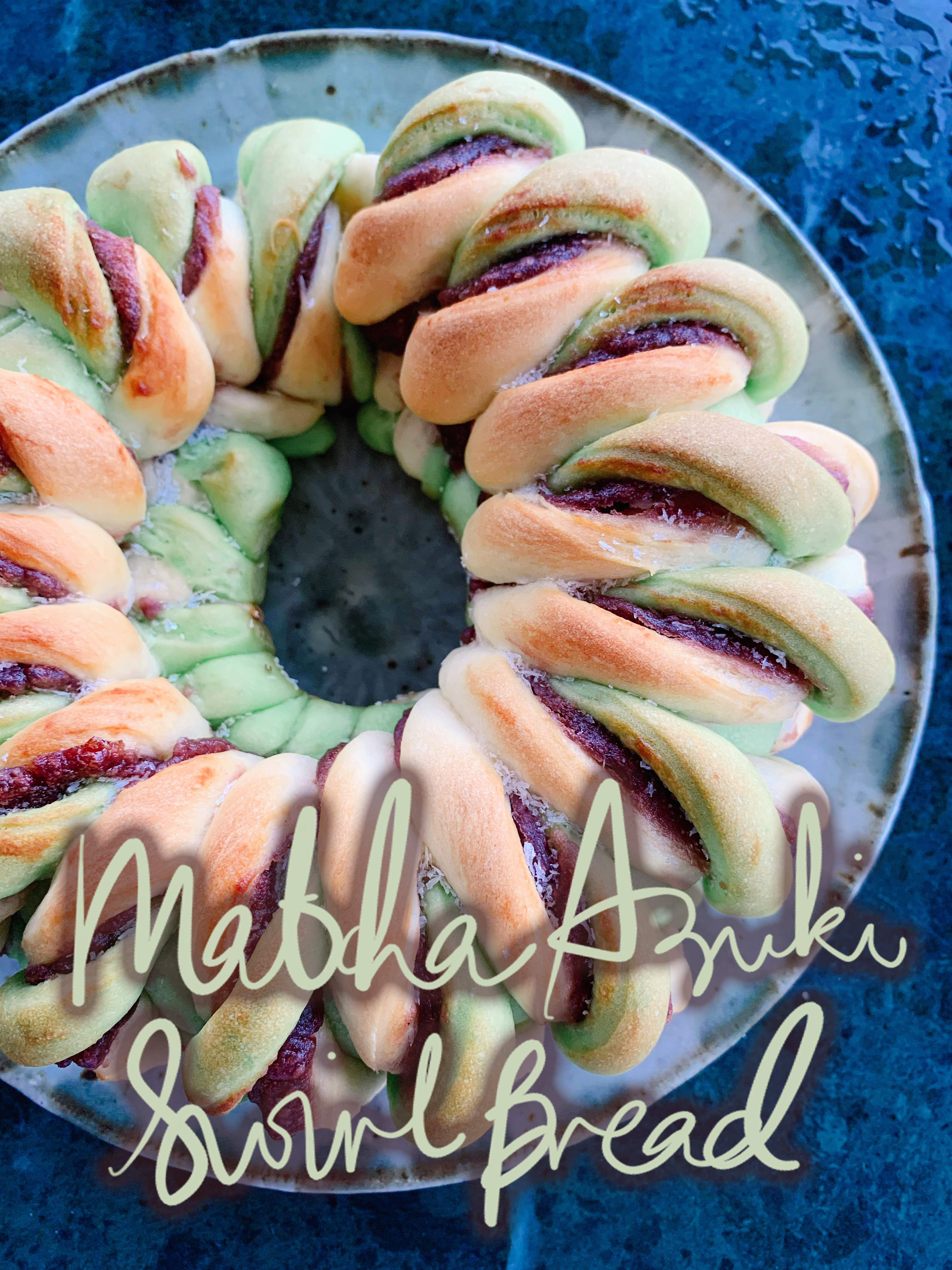 To make bread: Place bread flour into a mixing bowl. Add sugar, salt, yeast and mix well. Pour 190ml milk and mix with dough hook at low speed until dough forms. Add in softened butter. Mix on low speed until incorporated, then switch to medium high speed and knead until the dough is smooth. Knead for about 1 minute or until windowpane test is passed. Divide dough into 2 portions. Take one piece of dough and fold into a ball. Cover and allow to rise for 60 minutes until doubled. To make matcha bread: Add matcha powder and whipping cream (or warm water) and mix well until dissolved well. Add this mixture inside the other half of the dough ball. Mix well by folding the dough. Cover and allow to rise for 60 minutes until doubled. To assemble: Butter inside of a 8 inch chiffon cake baking pan. Pre-heat oven to 345°F/173°C. Roll out each ball into 1/8 inch thick rectangular shape. Spread red bean paste on one piece of the dough evenly. Cover with the second dough. Pinch and seal the edges together. Press to remove air. On the long side of the rectangular, cut vertically into 1/2 inch stripes, leaving around 2-inch margin at the bottom part of the rectangular dough. Twist the strips clockwise one by one. Roll the dough from the uncut surface to the other side. Place the bread into the baking pan by rolling around the chiffon cake ring hole. Cover and rest for 40 minutes until double in size. Bake in a 173°C oven for 20-22 minutes. Take out and set aside to cool. Enjoy!