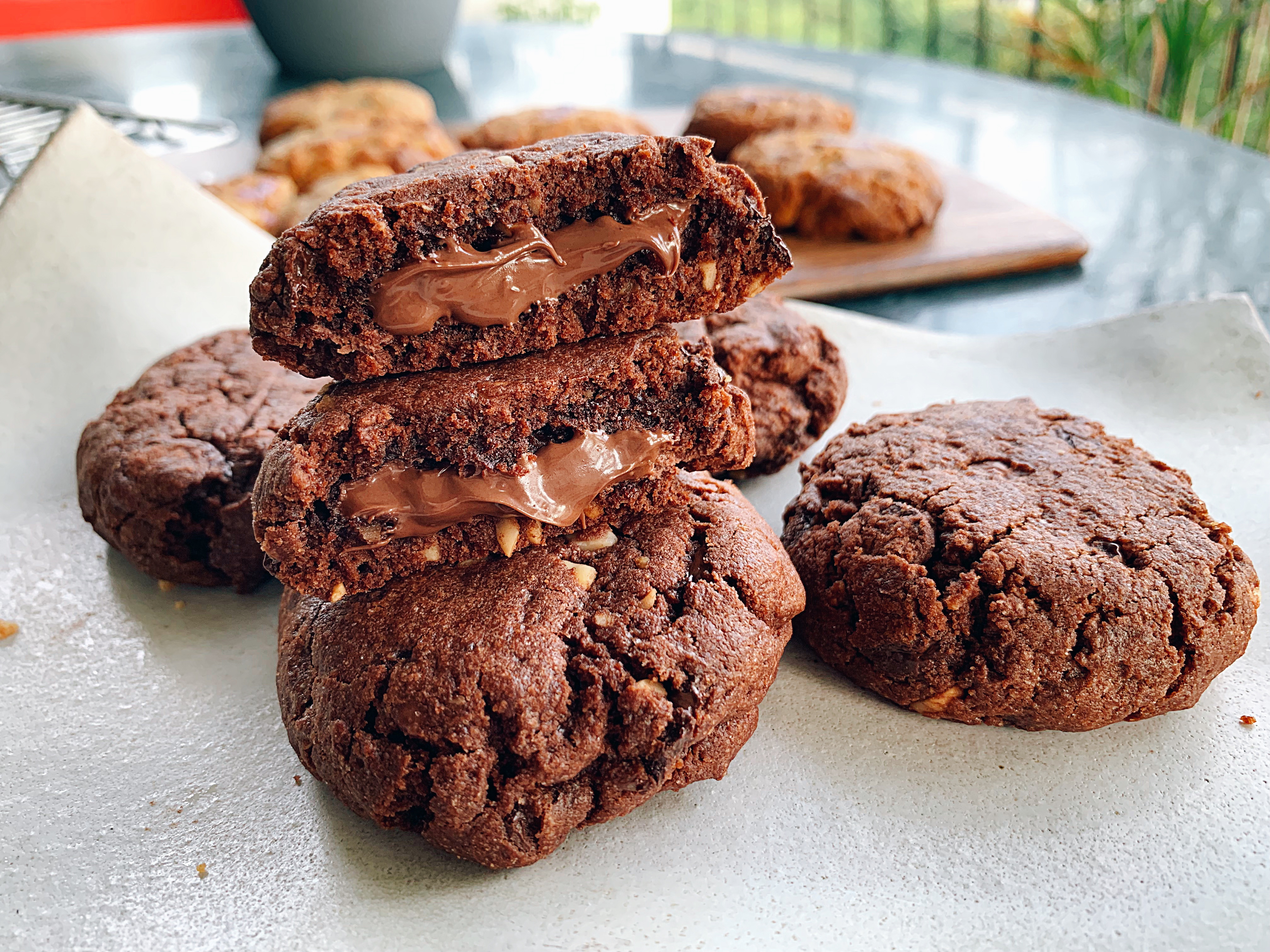 To Make Nutella filling Pipe nutella into balls, or use a silicone candy mould (similar to these) to portion out nutella. Freeze overnight or until solid. To make Cookie Dough Combine cold butter, caster sugar and brown sugar in a mixing bowl until clumps are formed. Place in chocolate chips, roasted hazelnuts. In a separate bowl, sift in plain flour, cocoa powder, baking powder and salt. Mix dry ingredients into the wet ingredients, and pulse until a sandy consistency. Mix in eggs one at a time. Portion around 100g dough and wrap around the frozen Nutella ball. Roll well until the edges are sealed (but don’t overwork the dough too much). Freeze for at least 2 hours or ideally overnight. Bake at 190°C (374°F) for 15 minutes. Allow to cool and enjoy!