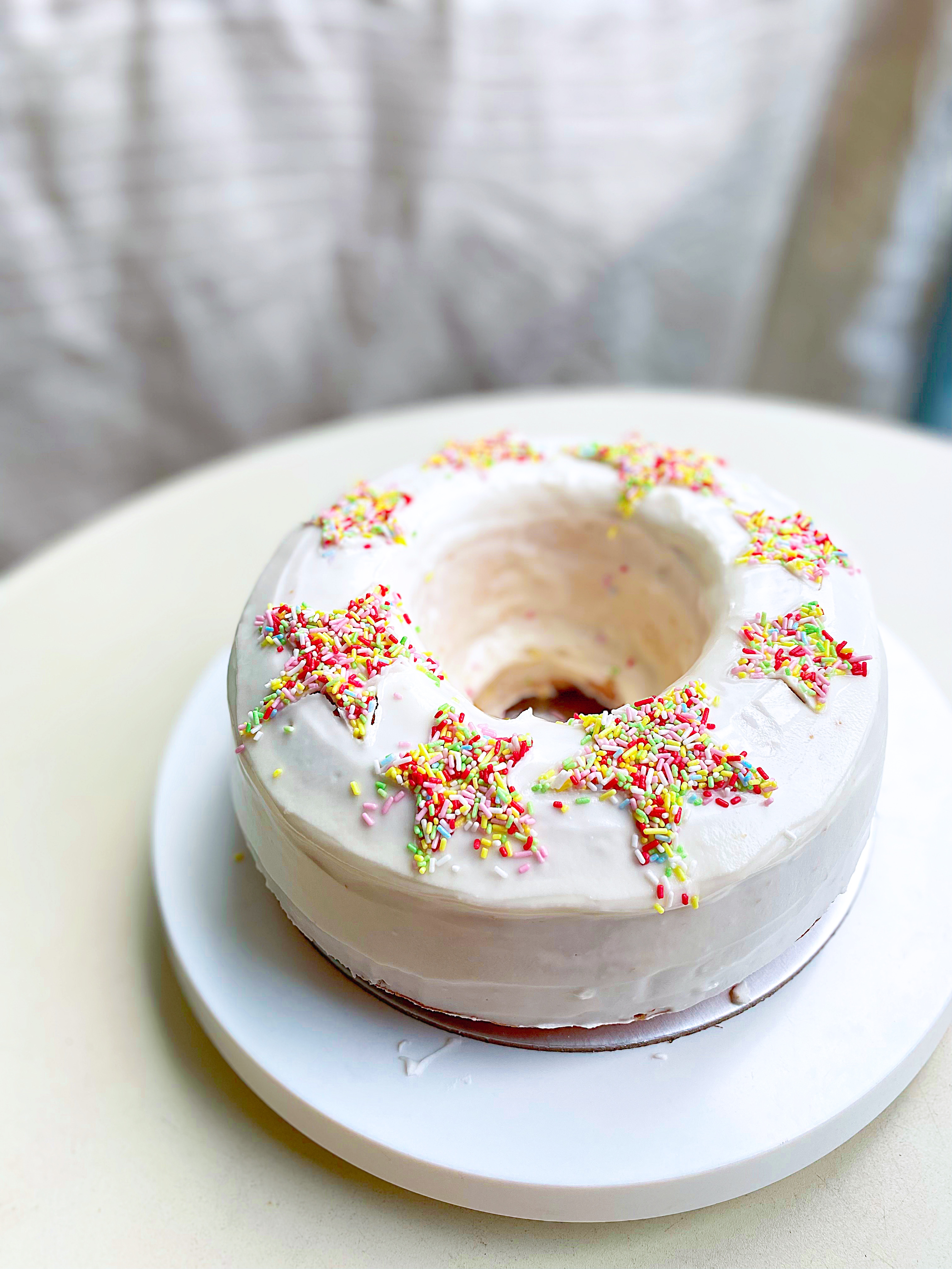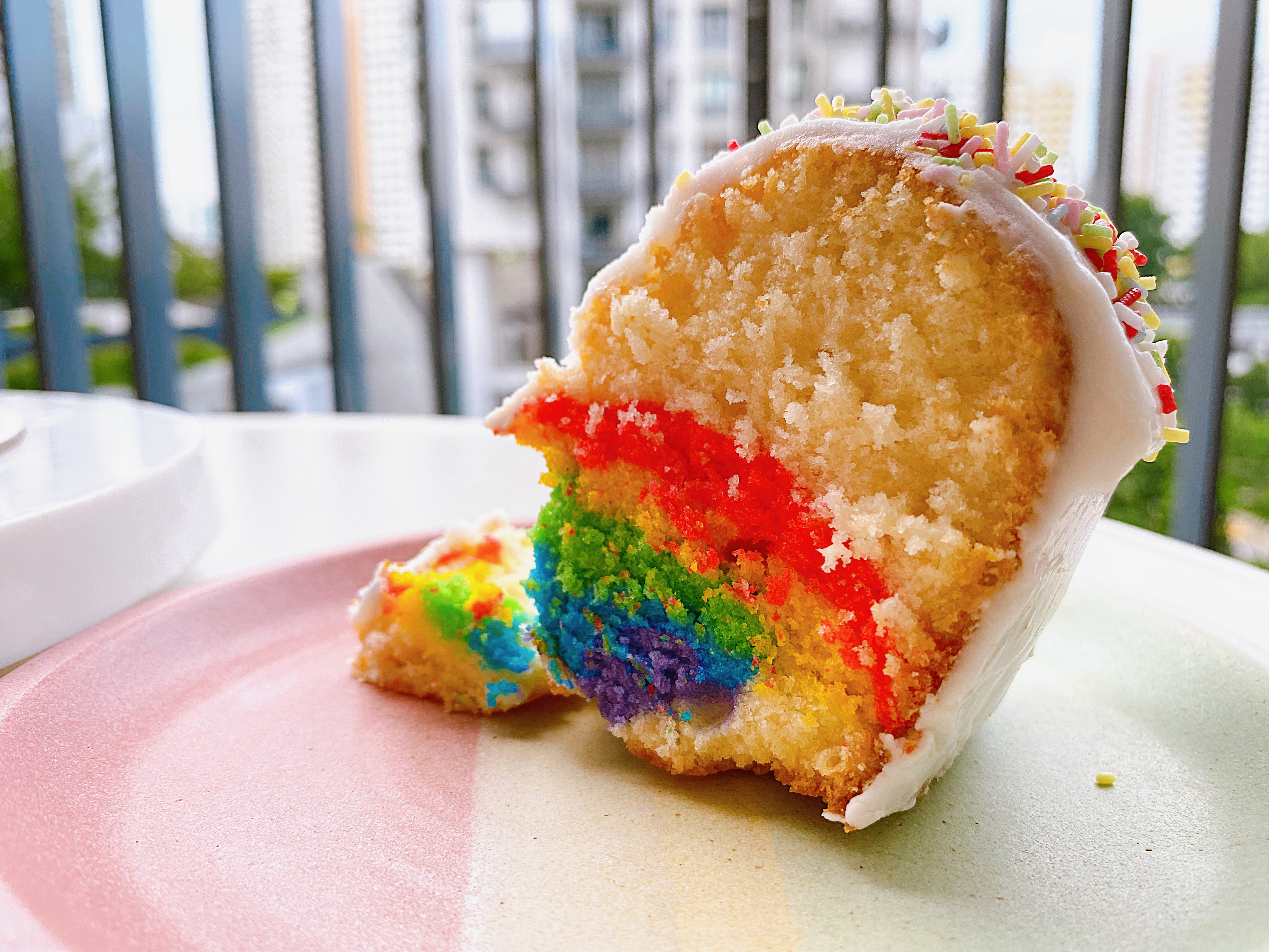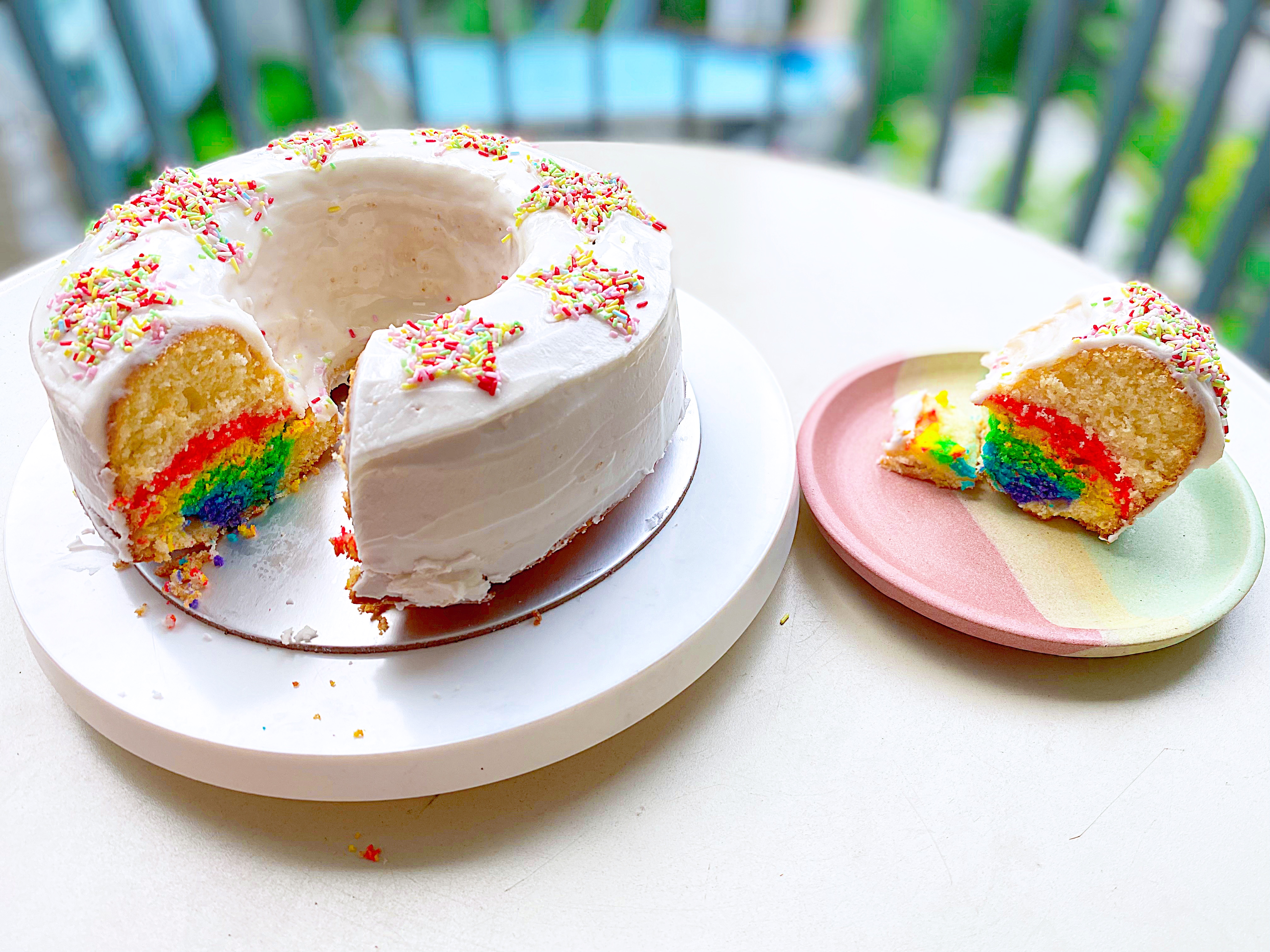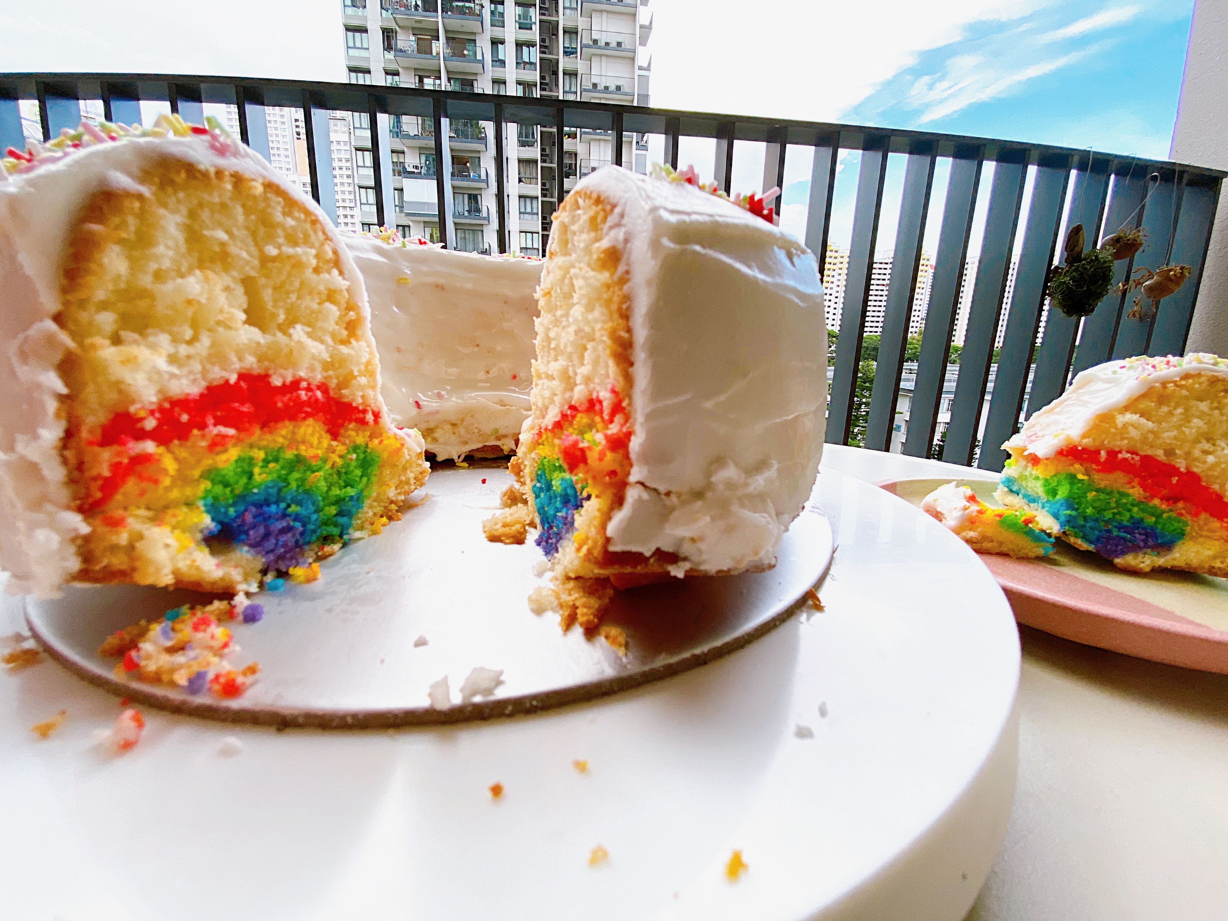 To make Vanilla Bundt Cake Preheat oven to 325 deg F or 160 deg C. Butter and coat a large bundt pan with almond flour (this helps to release the cake easily later! Sift together the all purpose flour and cake flour into a bowl. Set aside. Cream butter, coconut oil, vegetable oil and sugar together for at least 5 minutes, until very light and fluffy. Add salt, vanilla extract, and baking powder and whip for a few more minutes. With the mixer on, add egg whites, one at a time, allowing each to be fully incorporated before adding another. Add half of your flour mixture, and mix until just combined. With mixer on low, add buttermilk in a slow drizzle. Add rest of flour and beat just to combine. Technique: In 5 separate bowls, add about 4-5 tablespoons of batter. Using gel food colouring add red, yellow, green, blue and purple to each bowl and stir to combine the colours. Use about 2/3rds of the remaining batter to fill your bundt pan. Leave the last third aside. This will be used to cover the rainbow. Fill a piping bag with red batter and make a circle within the bundt on top of the white batter. Use the back of a teaspoon to smooth out the red batter and even it out by tapping the cake pan on the work surface. Fill a piping bag with yellow batter, and pipe it within the red. Continue with the rest of the colours, until you have a thin circle of purple. Use a spoon to gently add the rest of the white batter on top. Smooth top over with an offset spatula. Mine was enough for a 21-cm / 8.26 inch Bundt cake + a mini 13-cm / 5-inch funfetti cake (as the original recipe was made for a 9-inch cake). Measurements for my 21-cm Bundt cake: 480g white vanilla batter for the first layer, followed by 65g red, 65g yellow, 60g green, 55g blue, 50g purple, and 200g white vanilla batter to cover the cake. This recipe makes 1260g batter, leaving around 295g for the mini 13-cm funfetti cake. Bake for about 45-50 minutes (mine took 50 minutes), checking for doneness after 40 minutes. Allow cake to cool for about 15 minutes in pan, then invert onto a cooling rack. To make Vanilla Icing Glaze: Whip 1 egg white until soft peaks. Add in 200-300g icing sugar and whip well until a thick vanilla glaze. Add in 1-2 tablespoon of milk to achieve desired consistency. When cake is cooled completely, drizzle on the vanilla glaze. |