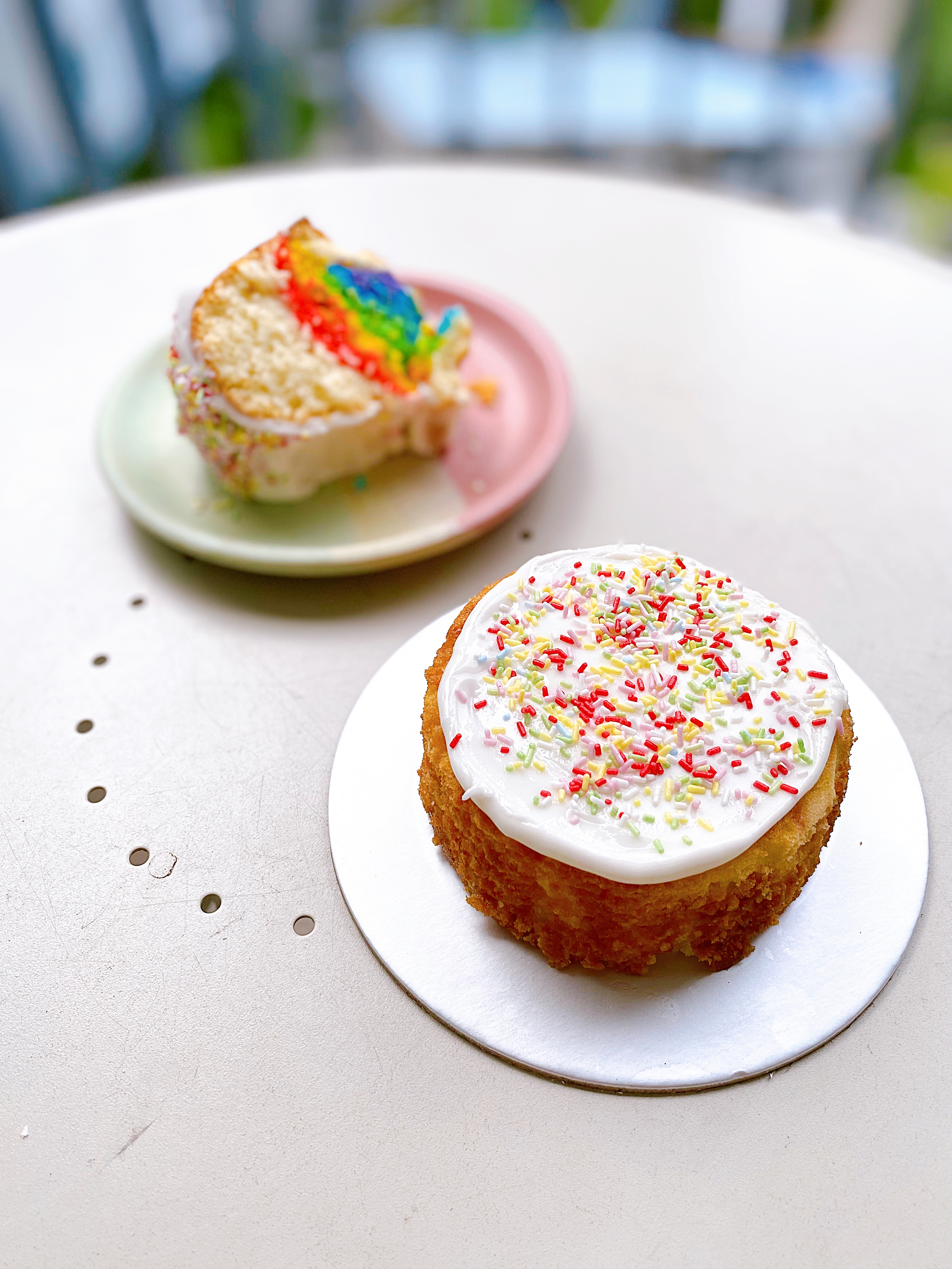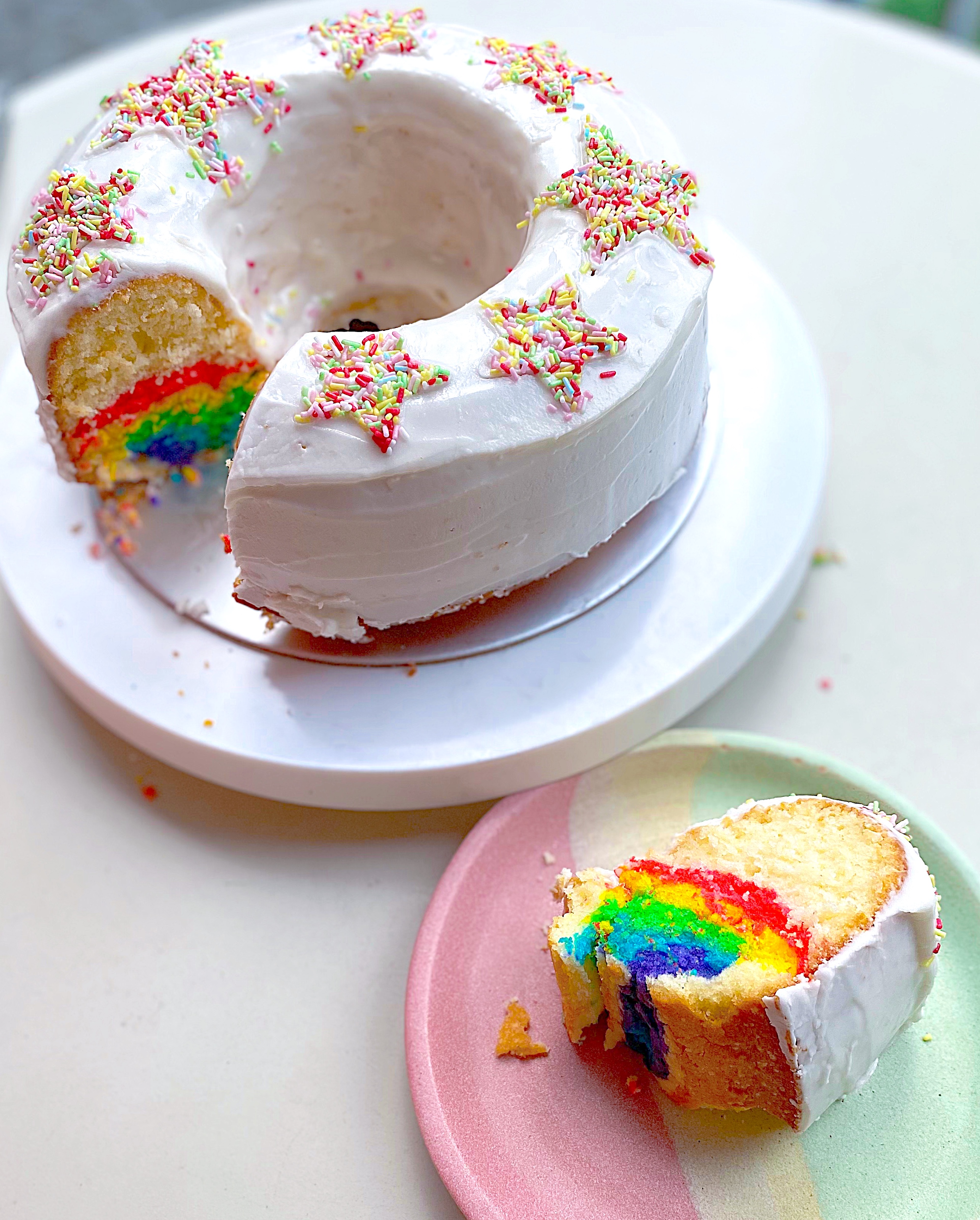 To create the hidden Rainbow surprise effect, I used a Bundt cake tin, a vanilla cake recipe and created coloured layers in rings. When you slice through, you get this gorgeous rainbow inside! You can use any 5 colours you’d like for the rainbow, and make sure to use a white cake recipe, so that the colour stands out even more. A combination of real and imitation vanilla gives you the nostalgic classic vanilla cake aroma, that is so simple but lovely. In this recipe I followed, Buttermilk by Sam also provided a video in her Instagram highlights you can check out 🙂