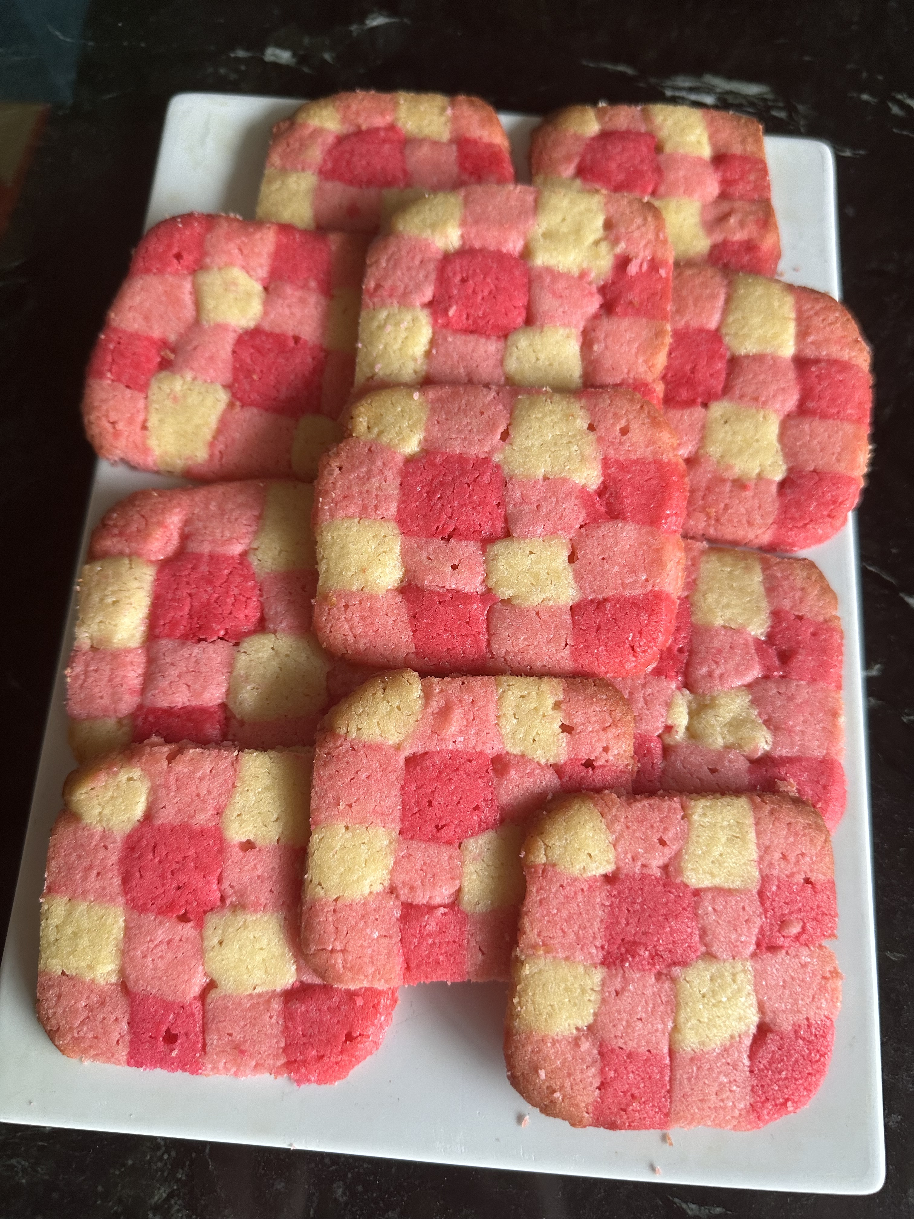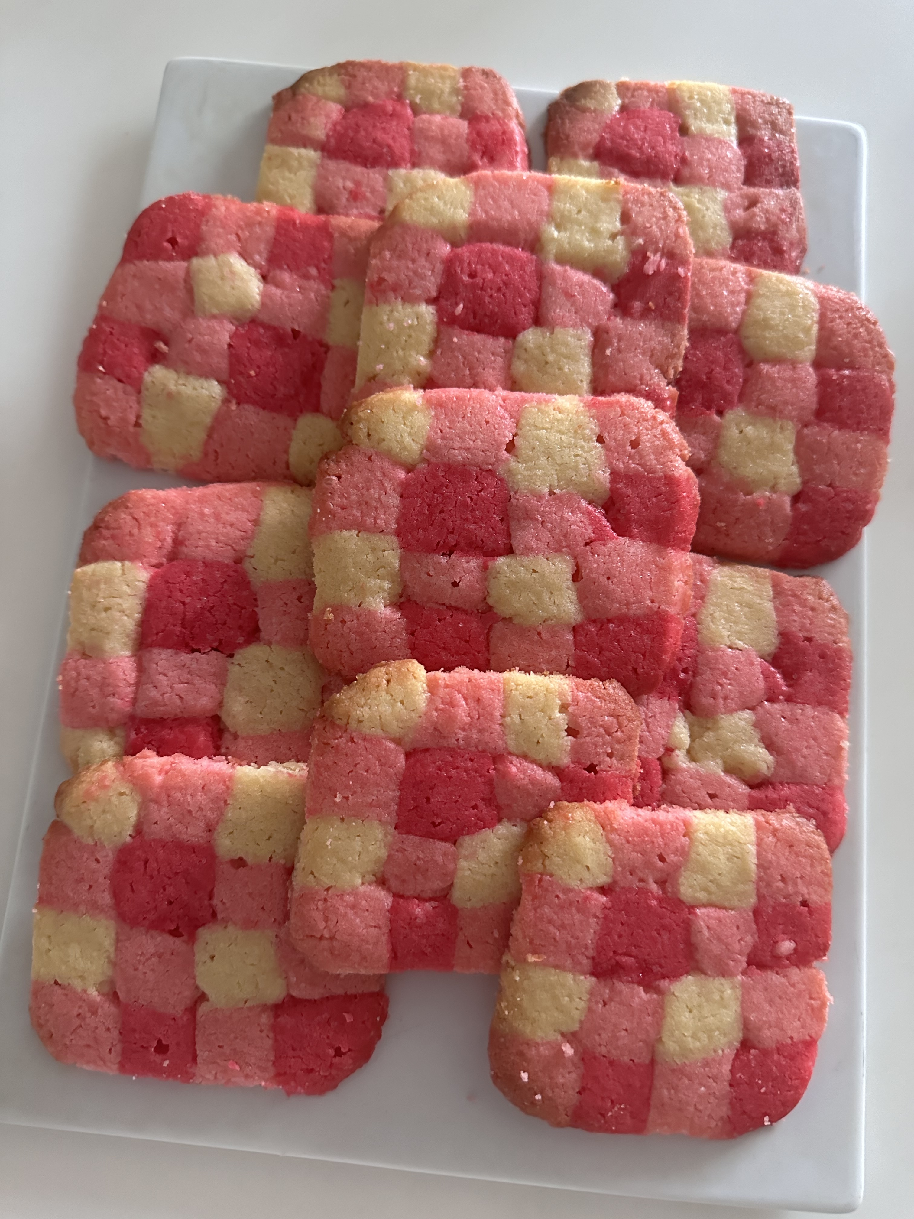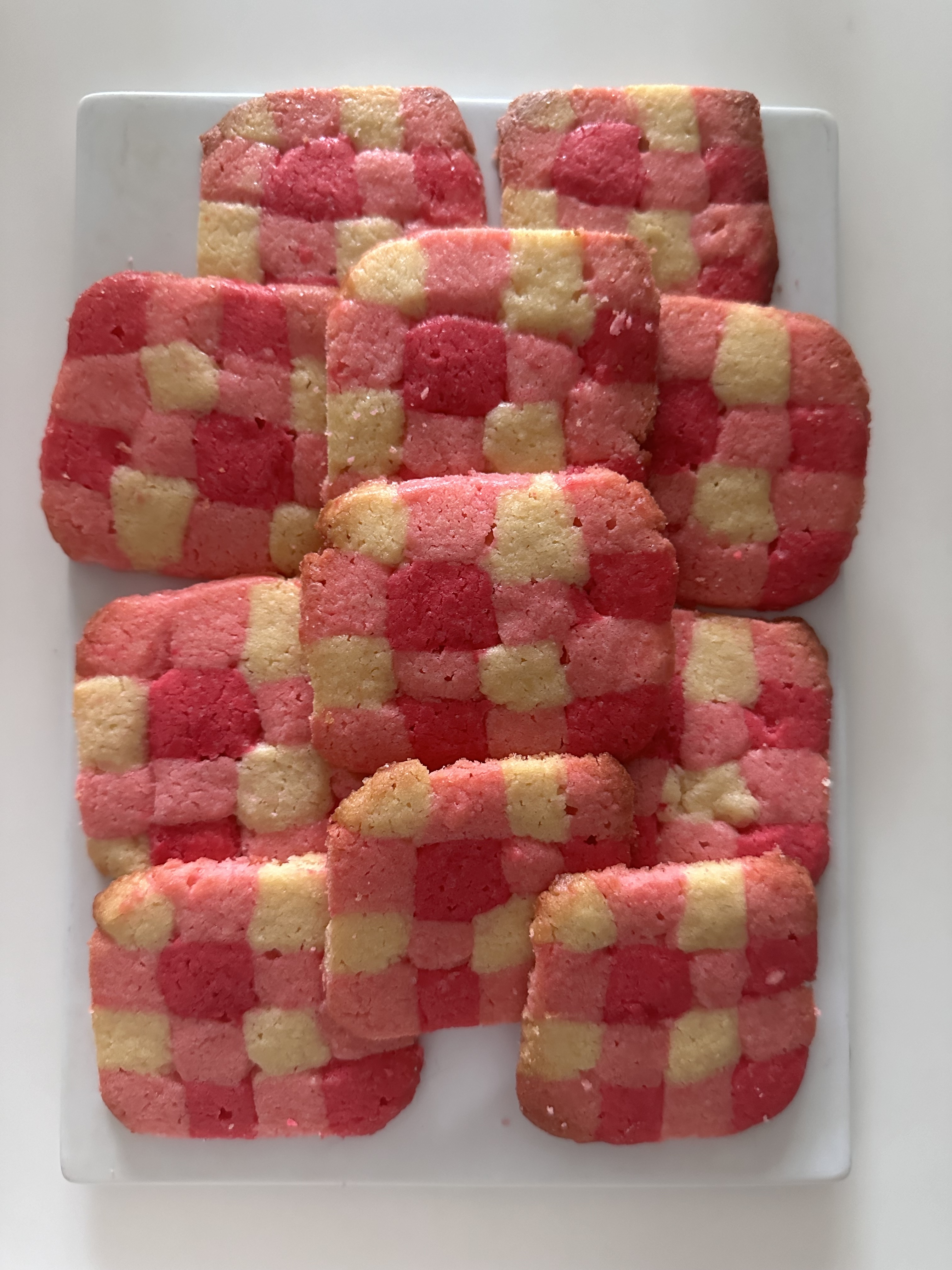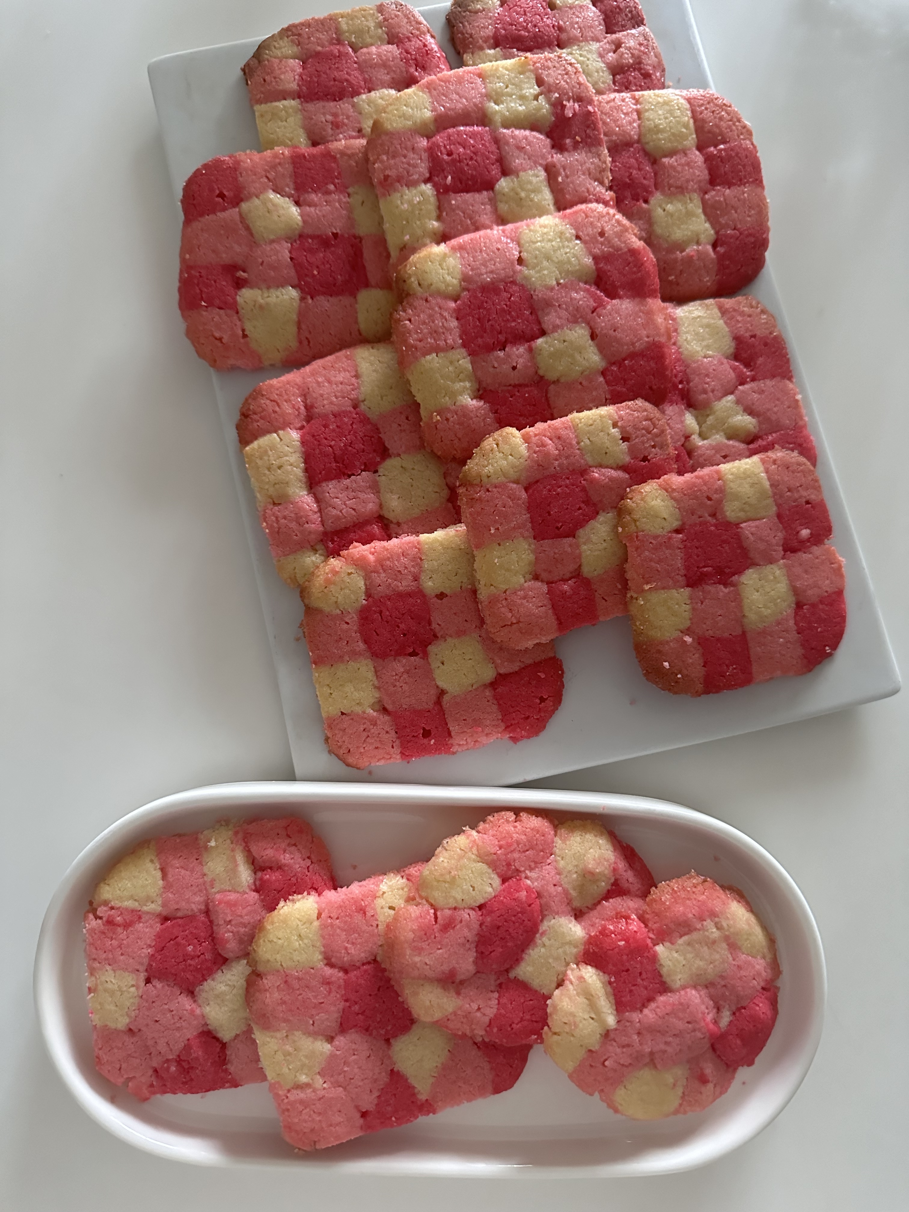 To make cookies Cream together the butter and sugar in the bowl of a stand mixer for 3 minutes. Scrape sides and add in vanilla and egg. Mix until combined. Add flour and baking powder to the bowl. Stir in flour and salt until just combined. Divide dough into 2:1:1 ratio. Add strawberry emulco as 2 different amounts into the dough – 2(light pink): 1(hot pink): 1(plain). Turn out onto a floured surface and roll to 1.2cm thick. Slice into 1.2cm x 1.2cm x 20cm strips. If the dough starts to warm and soften at any point, freeze for 15 minutes before continuing. Assemble the strips based on reference video (link here). When done, freeze the log until completely solid, at least 4 hours. Preheat the oven to 350°F (180°C). Thaw frozen dough for 15 minutes. Slice into 1.4 inch (0.6cm) thick and bake on parchment paper for 8-10 minutes, until just set. Tip: pull the cookies out of the oven just before they start turning brown. If they turn brown, the cookie will be dry instead of soft and chewy. Enjoy! |