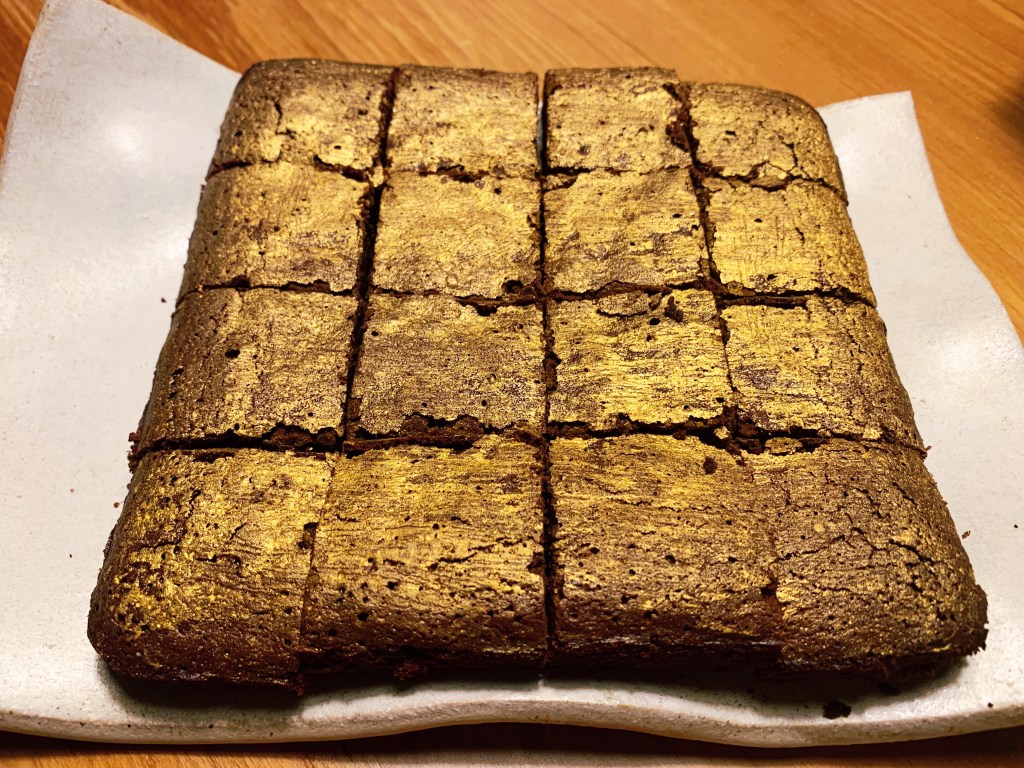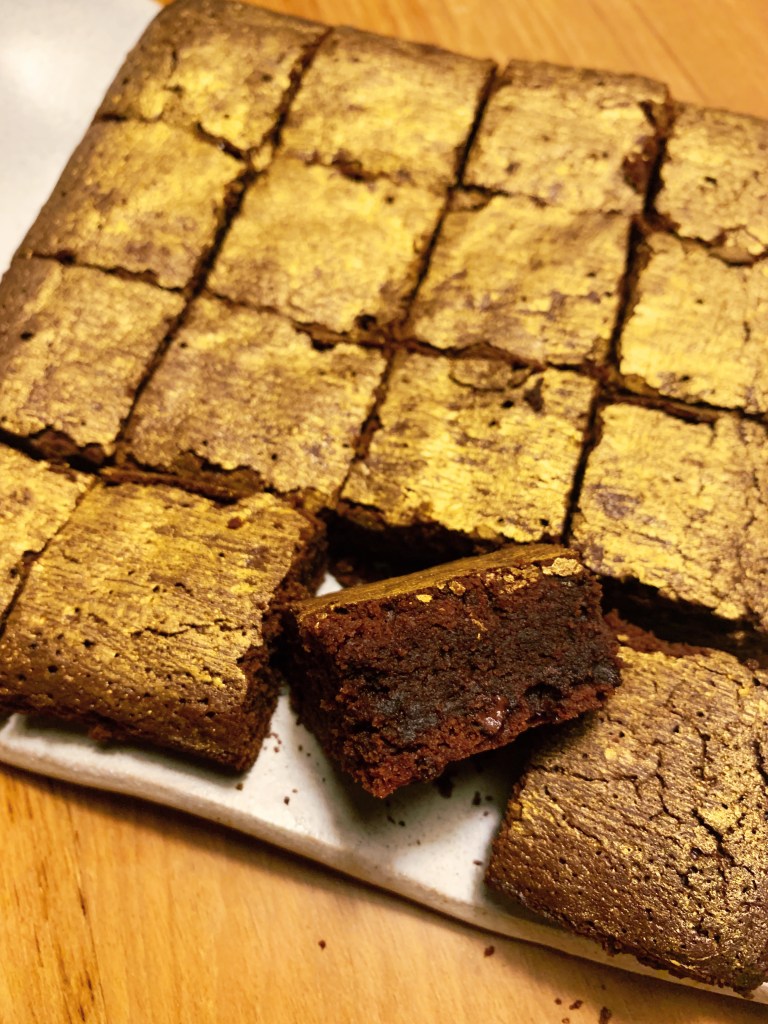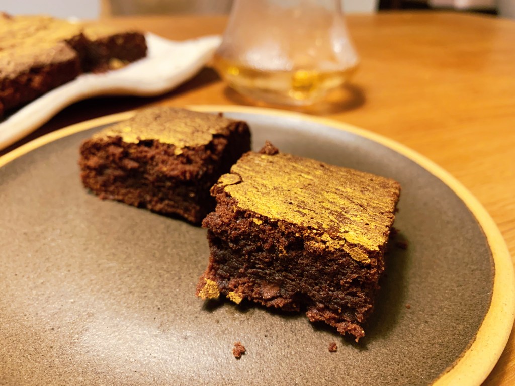 To make Whiskey Brownies Preheat oven to 350 deg F (175 deg C). Line and prepare a 8×8 inch baking dish. Sift and whisk together flour, cocoa powder, baking powder and salt into a bowl and set aside Combine with dry ingredients until just combined and add in any other brownie fillings you want (I used chocolate chips! Regular would work great, as my mini chocolate chips were too small) Pour into the brownie pan and level off. Bake for 25 to 30 minutes, toothpick should emerge mostly clean but some brownie debris is good. For my oven 30 minutes was a little too long. Cool until warm to touch. To decorate Mix gold luster dust powder with some whiskey or vodka, and brush on top of the cake for the glamorous touch! |