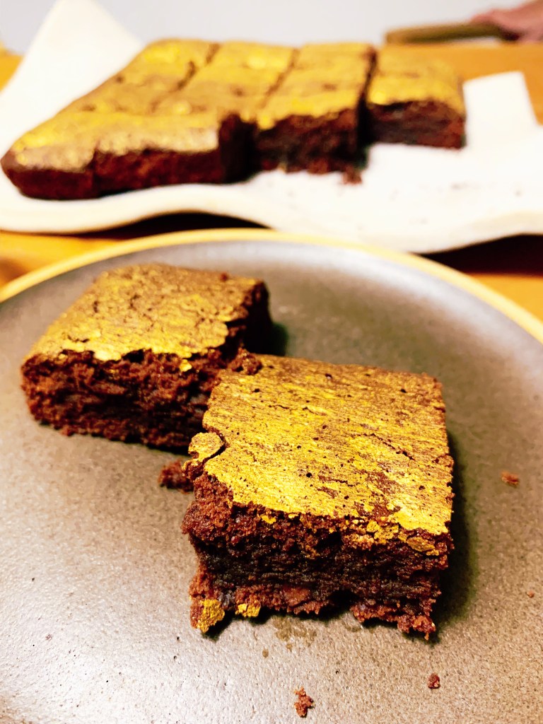 Whiskey brownies for Father’s Day! Brushed on gold luster dust mixed with more whiskey for the golden bar glow 🥳